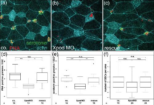 Figure 3. Xpod is required for MucXS and serotonin release. Xpod function was analyzed by the XpodMO‐mediated gene knockdown. (a–c) MucXS and serotonin loaded granules were detected by immunofluorescence using PNA (red) and anti‐serotonin antibody (green), respectively. Cell borders were visualized by actin staining (phalloidin, blue). (a–c) Controls (co.; a) showed MucXS and serotonin positive granules, which were reduced in Xpod morphants (b). Co‐injecting XpodMO and rescue‐Xpod mRNA restored secretion (c). (d–f) Statistical evaluation of frequency of PNA (d) and serotonin (e) positive granules per SSC. The number of SSCs per area is shown in (f). Statistical significance was calculated by Wilcoxon test. See Table S1 for p values