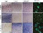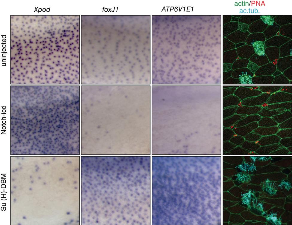 Figure 2. Notchâdependent SSC fate determination. Notch activation (middle) repressed SSC fates, while Notch repression (bottom) induced ectopic SSCs, as compared to wild type controls (top). mRNAs of dominant active intracellular domain of Notch (Nicd) or dominantânegative suppressor of hairless (Su(H)âDBM) were injected into the epidermal lineage at the 4â8 cell stage. At Stages 32â33, expression of marker genes for SSCs (Xpod), MCCs (foxj1), and ISCs (atp6ve1) were analyzed. In addition, MCCs and SSCs were identified by IF using antiâacetylated tubulin (blue) and antiâserotonin (red) antibodies, respectively. Actin staining by phalloidin (green) marks cell border