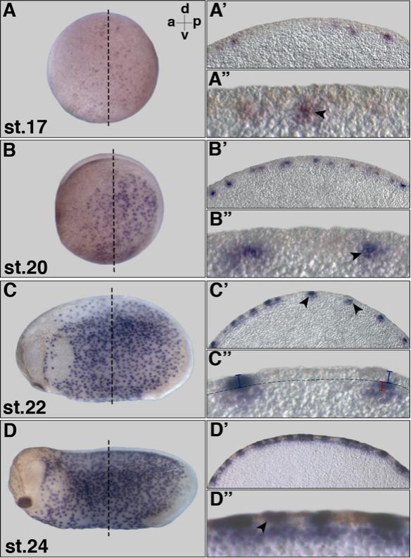 Fig. S1 Xpod mRNA expression during early SSC development. Xpod whole mount in situ hybridization at neurula (A) and early tadpole stages (BâD). Histological sections (AââDâ) revealed that SSCs expressed Xpod prior to intercalation into the superficial layer (arrowheads in close ups Aâ, Bâ²â or dashed line in Câ²â). At Stage 24, most SSCs were intercalated (arrowhead in Dâ).