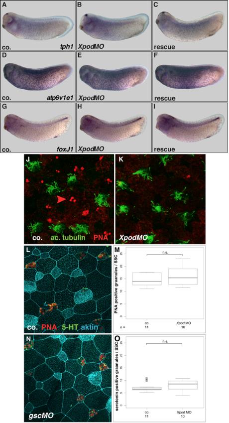 Fig. S3 No effect of Xpod knockdown on ISC, SSC and MCC specification as well as MCC ciliogenesis. Marker gene analysis by WMISH of untreated controls (co., A, D, G), Xpod morphants (B, E, H) and specimens coâinjected with MO and rescXpod mRNA (rescue; C, F, I). SSC, ISC and MCC identity were analyzed by tph1 (AâC), atp6v1e1 (DâF) and foxJ1 (GâH) expression, respectively. (J, K) IF using PNA (red) and antiâac. tubulin (green) antibody on control (J) and Xpod morphant specimens (K) did not reveal any differences in ciliogenesis. Note that PNA positive granules (red arrowheads) were present in controls but greatly reduced in Xpod morphants. (LâO) Release of mucus (PNA; red) and serotonin (green) was unaltered by gscMO (3â4 pmol/embryo) injections. (L and N). Statistical acquisition of data by Wilcoxon test. See also Table S1 for p values.