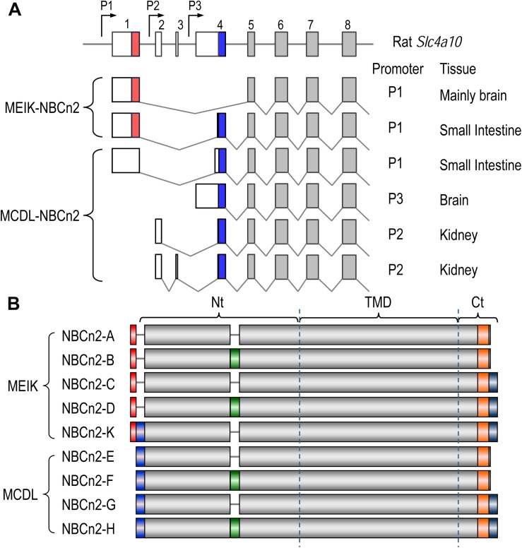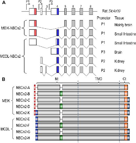 FIGURE 3. Diagrams of partial-exon structures of rat Slc4a10 transcripts and full-length variants of NBCn2. (A) Partial-exon structures of Slc4a10 transcripts. (B) Diagrams of predicted primary structures of full-length NBCn2 variants. Not shown here are two full-length variants identified in mouse NBCn2-I and -J with minor variation at the Ct end, as well as four Nt-truncated NBCn2 variants originally identified from rat kidney (Wang et al., 2015). NBCn2-K is predicted to start with âMEIKâ. However, the NBCn2 in small intestine can be detected with anti-MCDL, but not with anti-MEIK (see text in âDiscussionâ). |