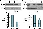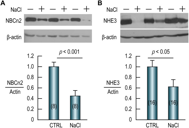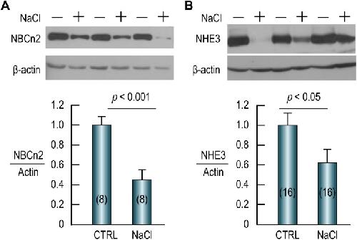 FIGURE 7. High NaCl intake decreases expression of NBCn2 (A) and NHE3 (B) in small intestine of rat. Membrane preparations of the small intestine were used for western blotting to examine the expression of NBCn2 (probed with anti-MCDL) or NHE3. The density of the target transporter in each lane was normalized to that of actin of the same lane. This ratio of each lane was then normalized to the average of the ratios of the control lanes in the same blot. Compared to the control, NaCl treatment decreases the abundance of NBCn2 by 55% and that of NHE3 by 40%. Numerals in the parenthesis indicate the numbers of rats included in each condition. For statistical comparison, two-tailed studentâs t-test was performed. âââ indicates the controls, whereas â+â indicates the rats treated with NaCl. |