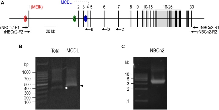 FIGURE 1. 5â²-RACE and RT-PCR analysis of Slc4a10 expression in small intestine of rat. (A) Diagram of structure of rat Slc4a10 gene. Rat Slc4a10 contains 30 exons and three promoters: promoter P1 (upstream of exon 1), P2 (located in the intron between exons 1 and 2), and P3 (located in the intron between exons 3 and 4). Exon 1 contains the coding sequence for unique Nt of MEIK-NBCn2. Exon 4 contains the coding sequence for the unique Nt of MCDL-NBCn2. Exons 6-26 boxed in gray encode the transmembrane domain of NBCn2. (B) Agrose gel analysis of 5â²-RACE of Slc4a10 from small intestine. (C) Agrose gel analysis of RT-PCR product of full-length Slc4a10 transcripts from small intestine. Arrows a, b, and c in panel (A) indicate the approximate positions of the primers used for 5â²-RACE. Arrowheads in panel (B) indicate the target bands of PCR products of Slc4a10. |