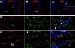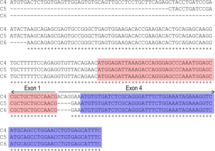 FIGURE 2. Sequence alignment of three partial clones obtained by 5â²-RACE. All three clones of C4, C5, and C6 include exon 1 (encoding âMEIKâ) and exon 4 (encoding âMCDLâ). Clone C4 contains additional 4 nucleotides (nt) âACAGâ at the 5â²-end of exon 4, and thus is predicted to express MCDL-NBCn2. Both clones 5 and 6 contain exon 1 and exon 4 in frame, and thus are predicted to express MEIK-NBCn2. Stars indicate the sequences identical in all three clones. The red boxes indicate the coding region of exon 1 for âMEIKâ â â â â â â, whereas the blue boxes indicate the coding region of exon 4 for âMCDLâ â â â â â â. |