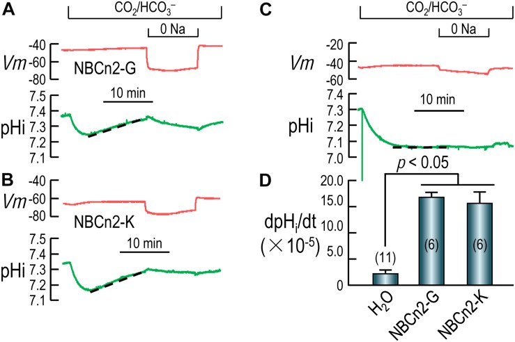 FIGURE 4. Functional characterization of NBCn2 in Xenopus oocytes. (A) Representative recordings of Vm and pHi of an oocyte expressing rat NBCn2-G. (B) Representative recordings of Vm and pHi of an oocyte expressing rat NBCn2-K. (C) Representative recordings of Vm and pHi of a control oocyte injected with H2O. (D) Summary of pHi recovery rate dpHi/dt. The dpHi/dt of both NBCn2-G and NBCn2-K are not significantly different from each other, but both are significantly higher than that of H2O-injected control oocytes by one-way ANOVA analysis followed by Fisherâs comparison. The numerals in the parentheses in panel D indicate the number of individual oocytes included in each bar. |