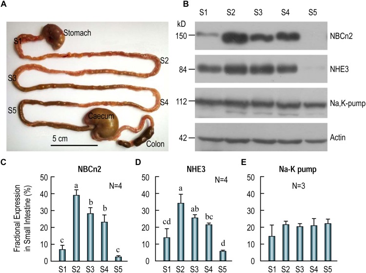 FIGURE 5. Distribution of NBCn2, NHE3, and Na+-K+ pump in different segments of rat small intestine. (A) Image showing the tissue collection sites for different fragments of the small intestine. S1, duodenum; S2, proximal jejunum; S3, middle jejunum; S4, distal jejunum; S5, ileum. Scale bar, 5 cm. (B) Western blotting of NBCn2 (with anti-MCDL), NHE3, and Na+-K+ pump in segments S1-S5 of the small intestine. β-actin is used as loading control. (C) Fractional distribution of NBCn2 in S1-S5. (D) Fractional distribution of NHE3 in S1-S5. (E) Fractional distribution of Na+-K+ pump in S1-S5. The density of NBCn2 was normalized to that of actin of the same lane from blots like those shown in panel (B). The fractional distribution of NBCn2 in each segment was computed by dividing this normalized density by the sum of the normalized densities of S1-S5. The fractional distribution of NHE3 and Na-K pump was computed by a similar approach. Ns in panels CâE indicate the number of rat individuals included in each panel. One-way ANOVA followed by Fisherâs comparison was used for statistical analysis. P < 0.05 is considered significantly different. Bars not marked by a same alphabet are significantly different from each other. |