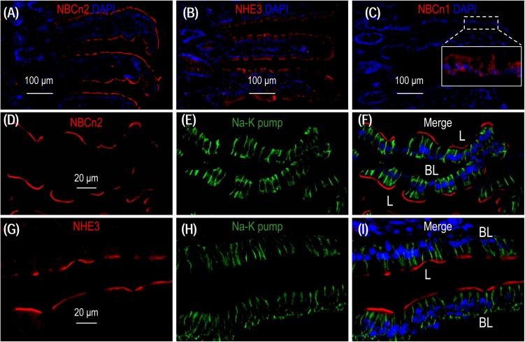 FIGURE 6. NBCn2 and NHE3 are expressed at the apical membrane of epithelium in small intestine. (A) Overview of staining with anti-MCDL (NBCn2) in the small intestine. (B) Overview of staining with anti-NHE3 in the small intestine. (C) Negative staining of anti-NBCn1 in the small intestine. In these experiments, the final concentrations of anti-MCDL, anti-NHE3, and anti-NBCn1 for immunofluorescence staining were 1.5 μg/ml (1:400 dilution). NBCn2 and NHE3 are mainly expressed in the villi of the small intestine. In panel C, no significant staining was observed for anti-NBCn1 when visualized under microscopy with parameters the same as those used for panel A and C. Inset in panel C shows that the non-specific background staining by anti-NBCn1, when visualized by a much higher exposure, is distributed throughout the cytosol of the epithelia. (DâF) High magnification view shows that NBCn2 is exclusively expressed at the apical membrane of small intestine epithelium. (GâI) High magnification view shows that NHE3 is exclusively expressed at the apical membrane of small intestine epithelium. In these experiments, the basolateral membrane is stained by α1 of Na+-K+ pump. |