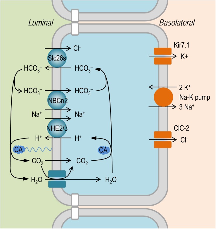 FIGURE 8. Model to show the hypothetical role of NBCn2 in small intestine epithelium. In the apical membrane, NHEs (e.g., NHE2 and NHE3) in concert with SLC26 transporters mediate NaCl absorption. The NaCl absorption via this pathway involves the action of carbonic anhydrase (CA) in both the luminal side and the cytosol. The presence of NBCn2 in the apical membrane likely provides an alternate pathway for the absorption of Na+ and the direct uptake of luminal HCO3â. In the basolateral membrane, NaCl extrusion is mediated by the coupled action of Na+-K+ pump and Clâ channel ClC-2 (Lipecka et al., 2002; Pena-Munzenmayer et al., 2005). Kir7.1 expressed in the basolateral membrane provides a pathway for the cycling of K+ (Partiseti et al., 1998; Nakamura et al., 1999). |
