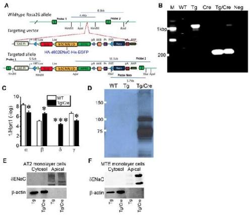 Figure 4. Humanized mouse line with inducible expression of human δ802-ENaC. (A) Schematic design for developing humanized mouse strain. δ802-ENaC was labelled with epitope tags of HA at the N-terminal and His at the C-terminal ends. The tagged hSCNN1D construct (HA-δ802 ENaC-His) was inserted into Rosa26 allele. Two lox and one stop codon were placed just prior to this construct. (B) RT-PCR analysis of inducible expression of δ802-ENaC. 3à stop primers were used with a size of 1,070 bp. The size is 199bp after removal of 3à stop codons. From left to right are samples from wild type lungs, Scnn1d Tg lungs, sox2 Cre lungs, δ802Tg/Cre lungs, and a negative control in the absence of RT enzyme. (C) Transcripts of ENaC subunits in the lung. The mRNA level of four ENaC subunits was analyzed by real-time RT-PCR. * P<0.05 and *** P<0.001 vs wt control. n=3. (D) Immunofluorescent images of δ802 ENaC proteins in the lung. Lung sections were stained with DAPI (blue for nuclei) and anti-His tag antibody to recognize δ802 ENaC (red). Scale bar, 10 μm. From left to right are images for wild type (WT, left), Scnn1d Tg (Tg, middle), and δ802Tg/Cre lungs (Tg/Cre, right). Top panels are for alveolar type 1 (AT1) cells stained with AQP5 as a biomarker. Bottom panels are for alveolar type 2 (AT2) cells stained with sftpc as a biomarker. (E) Detection of δ802 ENaC expression at the protein level with Western blotting assays. Tissue lysates of wt, Scnn1d (Tg), and induced lungs (Tg/Cre) were probed with anti-HA antibody. (F) Immunoblotting biotinylated apical proteins recognized by anti-HA antibody. Top blots are for δ-ENaC in apical and cytosolic proteins. β-actin was used as loading controls and quality control for biotinylation. These blots represent three experiments with similar results. |