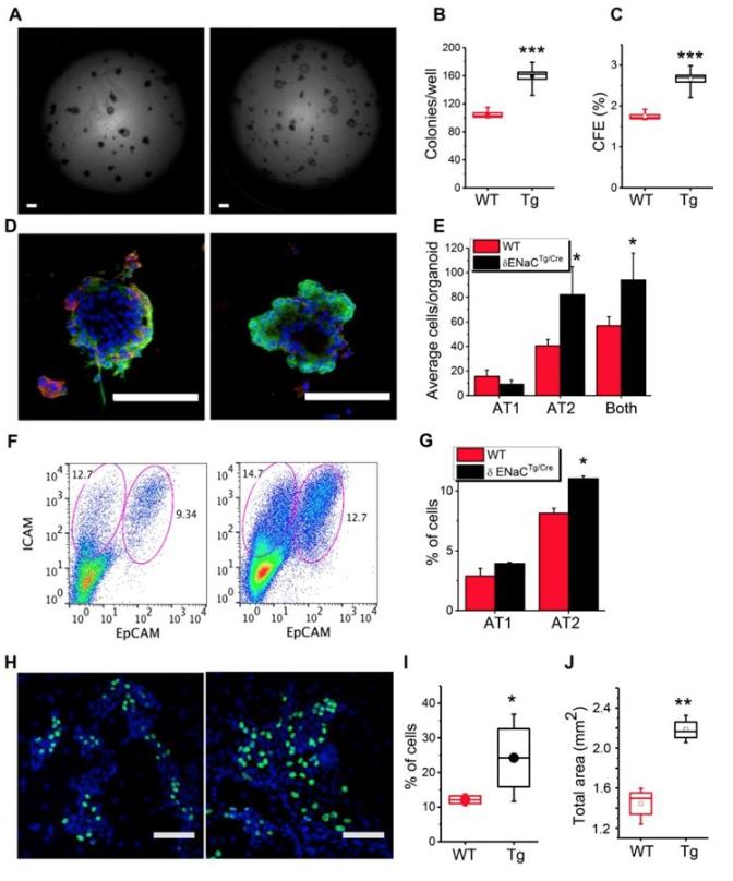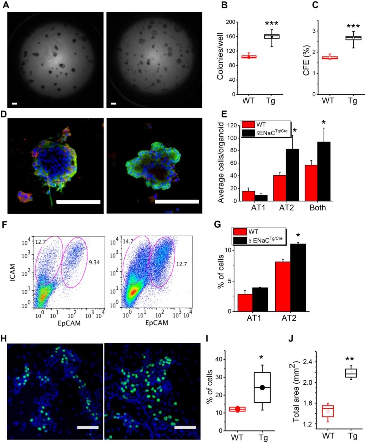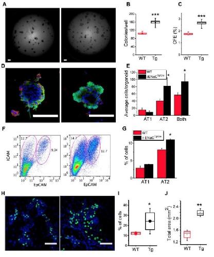 Figure 6. Contribution of δ802-ENaC to progenitor mAT2 cell-mediated alveologenesis. (A) DIC images of mAT2 organoids. Primary mAT2 cells of δ802Tg (left) and δ802Tg/Cre mice (right) were grown in 3D Matrigel for 7 days. Scale bar, 1 mm. (B) Organoid number per well. n=6. *** P<0.001. (C) Colony forming efficiency (CFE) of mAT2 cells. n=12. *** P<0.001. (D) Confocal imagines of organoids formed by mAT2 from δ802Tg (left) and δ802Tg/Cre mice. Scale bar, 100 μm. Organoids were stained with DAPI (blue), PDPN antibody for AT1 cells (red), and anti-sftpc antibody for AT2 cells (green). (E) AT2 renewal and differentiation into AT1 cells. n=6 organoids. * P<0.05 vs WT group. (F) FACS assay of AT1 and AT2 cells in organoids. Representative FACS analysis of AT1 (ICAM+) and AT2 (EpCAM+) cells for WT (left) and δ802Tg/Cre group (right). n=3. (G) % of AT1 and 2 cells. n=6. * P<0.05. (H) EdU stain of mAT2 monolayers for WT (left) and δ802Tg/Cre groups (right). Polarized mAT2 monolayers on day 7 post seeding were stained with EdU (green). (I) % of EdU+ cells. n=6 monolayers per group. * P<0.05. Student t-test. (J) Total surface area of organoids per well. n=6. ** P<0.01. |