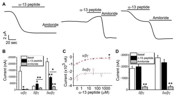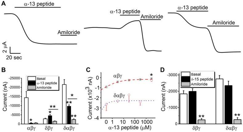 Figure 2. Responses of δ802-ENaC-containing channels to α-13 inhibitory peptide. (A) Representative current trace of αβγ- (left), δ802βγ- (middle), and δ802αβγ-ENaC (right) expressed in Xenopus oocytes. The horizontal lines under α-13 (300 μM) and amiloride (10 μM) indicate the time for application. Scale bars at the left bottom corner are for time and current amplitude. The current traces were digitized at the membrane potential of -100 mV. (B) Average current amplitude at -100 mV for the three types of ENaC channels in the absence (basal) and presence of α-13 inhibitory peptide and amiloride. n=5. * P < 0.05 and ** P < 0.01 vs basal current levels or as indicated by the horizontal lines. (C) Concentration-effect relationship of α-13 inhibitory peptide on αβγ-ENaC channels. Dashed (for αβγ) and dotted lines (for δ802βγ) are generated by fitting the raw data points except the most right one for amiloride with the Hill equation. The retrieved IC50 values for α-13 inhibitory peptide are 0.1 ± 0.01 μM (n=4, Chi2 = 0.44, R2 = 0.993), and 0.04 ± 0.07 μM (n=3, Chi2 = 0.77, R2 = 0.86), respectively. * indicates the current levels in the presence of amiloride (10 μM). (D) Effects of δ-15 peptide corresponding to α-13 sequence. δ-15 peptide was designed by aligning the amino acid sequences of δ802- and α-ENaC subunits. The sequence of 15 amino acid residues corresponding to that of α-13 inhibitory peptide was synthesized (Figure S2). The same concentration (30 μM) was perfused to the oocytes expressing δ802βγ- and δ802αβγ-ENaC channels. Amiloride (10 μM) was added to confirm the expression of ENaC. Current data at -100 mV were mean ± s.e.m. ** P<0.01 vs basal levels. n=3. |