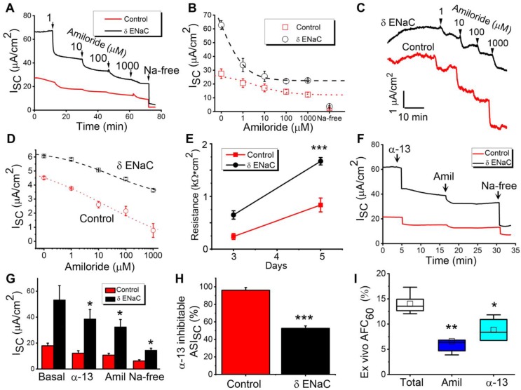 Figure 5. Functional analysis of δ802 ENaC activity in mouse tracheal epithelial (MTE) and alveolar type 2 (mAT2) monolayers. (A) Short-circuit current traces (Isc) in MTE monolayers mounted on an Ussing chamber setup for uninduced δ802Tg (Control, black line) and induced δ802Tg/Cre (δ-ENaC, red line). Primary MTE cells were cultured at the air-liquid interface for 13-15 days. n=3. Arrows indicate the time to add designed concentrations of amiloride. (B) Dose-response relationship of amiloride for δ-ENaC expressing MTE monolayers and controls. Raw data were fitted with the logistic function to compute ki values for amiloride. The resulting ki values were 0.68 ± 0.00 μM and 3.04 ± 0.26 μM, respectively, for control and δ-ENaC group. Data collected when cells were bathed with Na+-free solution were included but not used for fitting curves. n=5. (C) Representative Isc traces for control and δ-ENaC mAT2 monolayer cells. Accumulating amiloride from 1 to 1,000 μM were applied as indicated by arrows. (D) Dose-response curve for amiloride in mAT2 cells. (E) Transepithelial resistance measured with an EVOM meter. Resistance was read with a chopstick meter when the culture medium was replaced every other day. n=7, *** P<0.001 vs controls. (F) Representative Isc traces for α-13 peptide inhibition. α-13 inhibitory peptide (300 μM) was added to the apical counterpart followed by amiloride and finally by Na+-free bath solution as indicated. (G) Average Isc levels in the presence and absence of α-13 inhibitory peptide (300 μM), amiloride (100 μM), and Na+ ions (150 mM). n=6. * P<0.05 vs control. (H) Isc fractions associated with αβγ-ENaC and δ802βγ-ENaC subpopulations as computed as α-13 inhibitable (α-13 peptide sensitive) and the component inhibited by amiloride and removal of bath Na+ ions (α-13 peptide resistant). n=6. * P<0.05 vs controls. (I) α-13 and amiloride-sensitive alveolar fluid clearance in human lungs ex vivo. n=5 per group. * P<0.5 vs control. Data were presented as mean ± s.e.m., mean difference between two groups was computed by student t-test in (E-H). |