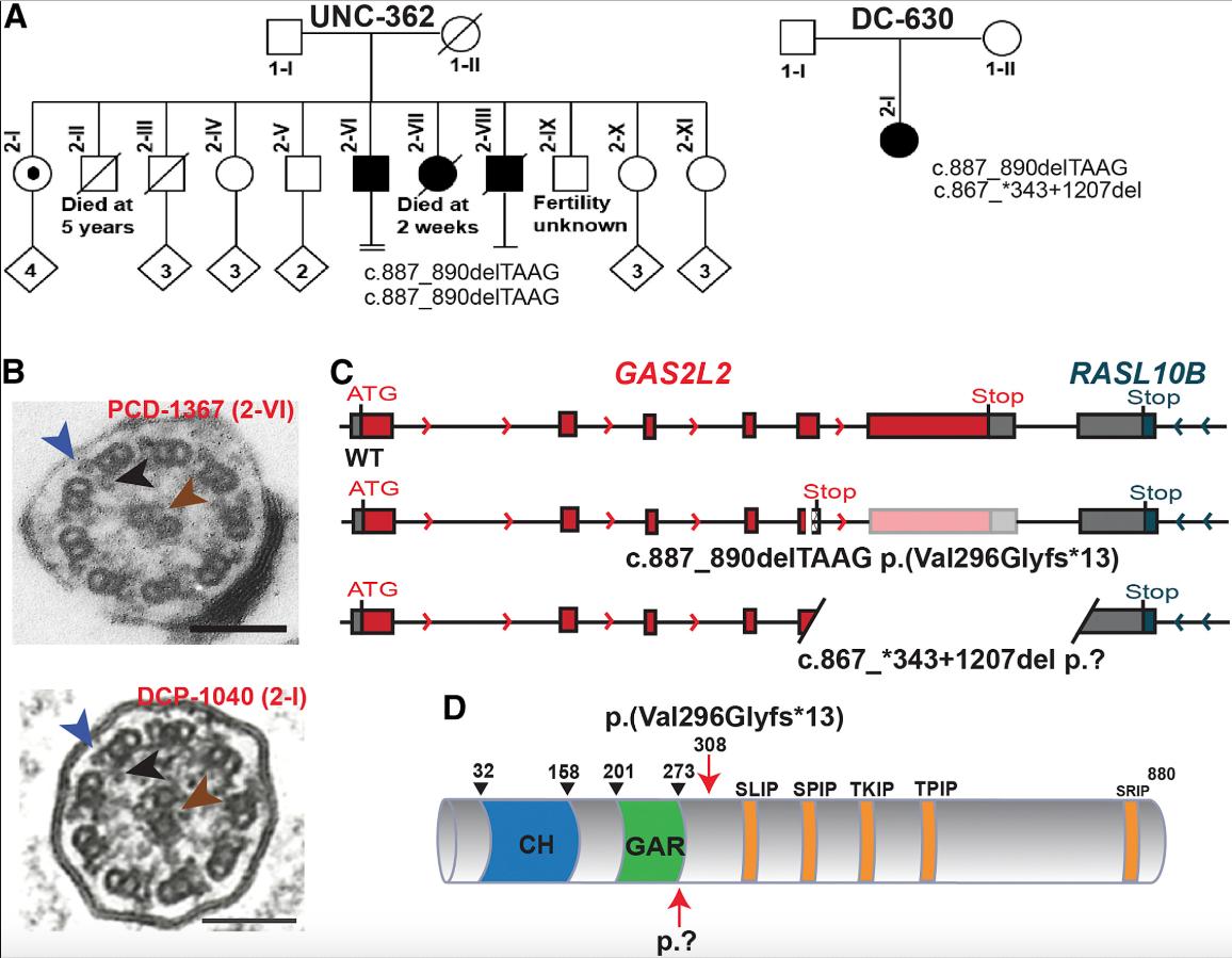 Figure 1. GAS2L2 Pathogenic Variants in Individuals with PCD (A) Segregation analysis of GAS2L2 genetic variants found in family UNC-362 (c.887_890delTAAG [p. Val296Glyfsâ13]) and in family DC-630 (c.887_890delTAAG;867_â343+1207del [p.Val296Glyfsâ13;?]). Filled symbols indicate PCD-affected individuals. In family UNC-362, individual 2-I is a heterozygous carrier, individual 2-II died at age 5 years as a result of a ruptured appendicitis. Individual 2-III was a lifelong smoker and died of lung cancer at â¼55 years. Individual 2-VI is proband PCD-1367. Individual 2-VII was a term neonate suspected to have had PCD as a result of neonatal respiratory distress and severe hypoxemia. She died at 2 weeks. Individual 2-VIII is suspected to have had PCD as a result of phenotypic features including daily cough and bronchiectasis at age 10 years with subsequent lobectomy. He passed away from lymphoma at 50+ years. (B) A transmission electron micrograph of axonemal cross sections of nasal epithelium from both probands shows the central pair (brown arrowhead) surrounded by nine microtubule doublets. Outer dynein arms (blue arrowhead) and inner dynein arms (black arrowhead) project from each doublet normally. (C) Schematic representation of the GAS2L2 variants found in the PCD-affected individuals. The top panel shows normal exon-intron structure, the middle panel shows the small four-nucleotide deletion (c.887_890del) that introduces an early stop codon, and the bottom panel shows the large deletion (c.867_â343+1207del) that is also located in exon 5. Red boxes indicate the coding exons, patterned boxes indicate out-of-frame sequence, and gray boxes indicate the 5â² and 3â² UTRs. (D) Schematic representation of GAS2L2 structure. It contains a calponin homology (CH, blue) domain and a GAS2-related domain (GAR, green), which might mediate binding to the actin cytoskeleton and MT, respectively. Conserved SxIP motifs for interaction with EB proteins are indicated in orange. The location of the mutations is indicated by the red arrows. The small deletion induces a frameshift variant that introduces a stop codon in amino acid 308. The large deletion disrupts the protein after the GAR domain. |