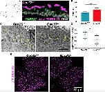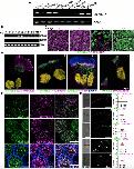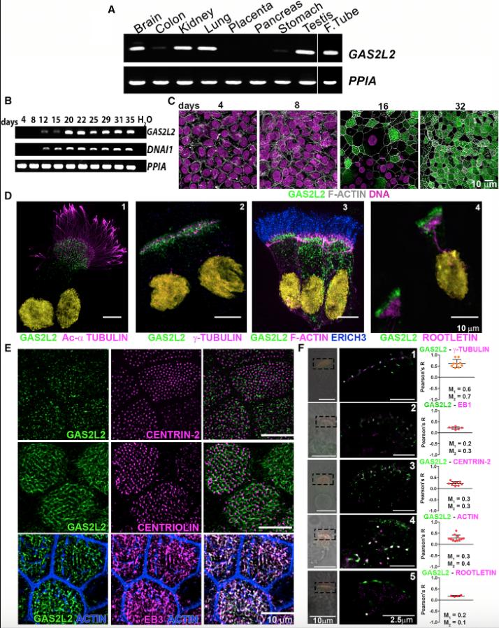 Figure 2. Expression and Localization of GAS2L2 (A) Total RNA from different human tissues was used for determining the expression of GAS2L2. PPIA was used as a reference. (B) Expression of GAS2L2 in normal HBE cells. Total RNA was extracted at the different indicated days of ALI culture. The expression of GAS2L2 correlated with the expression of DNAI1, a ciliated-cell-specific gene. PPIA was used as a reference. (C) Whole-mount immunofluorescence. HBE cultures were fixed at different days during the differentiation of airway cells and stained for actin filaments (gray) and GAS2L2 (green), and nuclei (magenta) were labeled with Hoechst 33342. GAS2L2 was not detected in undifferentiated cells (days four through eight). It was observed in the cytoplasm of HBE cells (day 16), and it was strongly present in fully differentiated cultures (day 32). (D) Isolated cell immunofluorescence. Cells were stained for GAS2L2 in green and in magenta: (1) the ciliary axoneme marker Acetylated-αtubulin; (2) basal-body marker γ-tubulin; (3) actin filaments and ERICH3 (blue), a ciliary axoneme marker; and (4) the rootlet marker rootletin. Nuclei (yellow) were labeled with Hoechst 33342. (E) Whole-mount culture immunofluorescence. GAS2L2 is closely associated with centrin-2 (top panel) and centriolin (middle panel). GAS2L2 strongly localizes with EB3 (bottom panel). (F) Single-molecule detection using GSD super-resolution microscopy showing representative images of cells stained with GAS2L2 (green) and in magenta: (1) γ-tubulin, (2) EB1, (3) centrin-2, (4) actin, and (5) rootletin. The boxed area in the bright-field image was scanned in GSD mode. Pearson coefficients for each analyzed cell are represented in the graph (n ⥠4). The average Manders coefficient for GAS2L2 (M1) and the partner protein (M2) are indicated. |