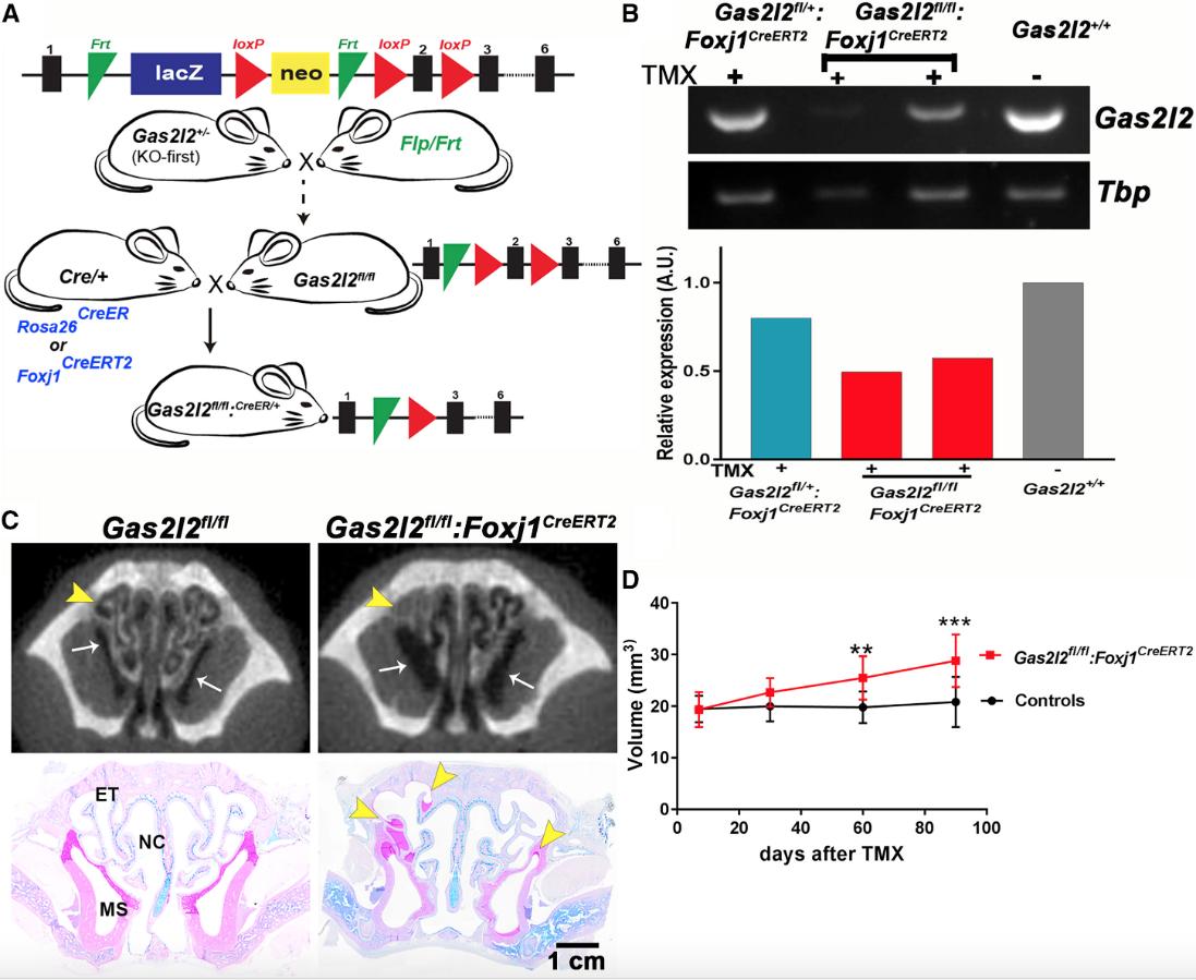 Figure 7. Partial Deletion of Gas2l2 in Mice Induces a PCD-like Phenotype (A) Schematic representation of the generation of Gas2l2-conditional-KO mouse. See Material and Methods for details. (B) Reduced expression of Gas2l2 was confirmed by RT-PCR with RNA extracted from trachea rings. Tbp was used as reference for normalization. (C) Representative micro-CT scan and AB-PAS histology of animal heads after 90 days of treatment. Mucus accumulation in the turbinate (arrow head) and increased volume of the sinuses (arrow) was observed in the conditional-KO mice but not in the control. Abbreviations are as follows: ET, ethmoturbinates; MS, maxillary sinus; and NC, nasal cavity. (D) Measurement of total nasal-cavity air space in all the animals (n = 41) included in these experiments. A significant increase in nasal air space in the conditional-KO mice (red line) compared to controls (black line) was first observed at 60 days after treatment (each data point corresponds to the mean + SD; ââp = 0.0013; âââp = 0.0003, Studentâs t test, Welch-corrected). |