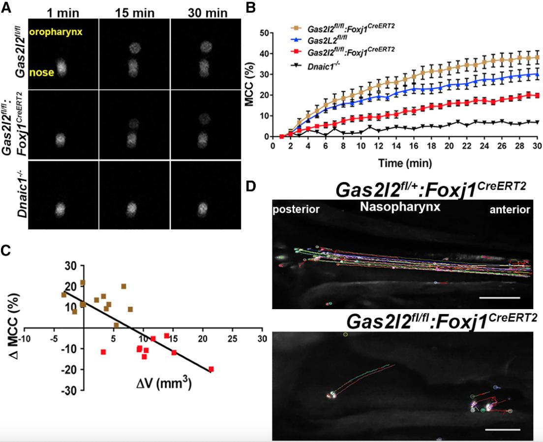 Figure 8. Deletion of Gas2l2 Affects Mucociliary Clearance in Mice (A) Representative scintigraphy images of real-time measurements of nasal clearance in mice via Technetium-99. Radiolabeled particles were delivered into the nose (left panel). The clearance was recorded over time (middle and right panels) with a gamma camera. (B) Cumulative nasal clearance in Gas2l2-conditional-KO (n = 21), controls (n = 20), and Dnaic1â/â (n = 3) treated with TMX. In the Gas2l2-conditional-KO two groups were observed: a group with normal clearance (brown squares, n = 12) and a group with impaired clearance (red squares, n = 9). (C) Correlation between the change in MCC in Gas2l2-conditional-KO mice relative to controls and ÎV in the two groups of Gas2l2-conditional-KO mice (r = â0.7151, p = 0.0018). (D) Time-lapse images of 600 frames (5 frames/s) representing the nasopharyngeal clearance of fluorescence beads in control and Gas2l2-conditional-KO mice (the scale bar represents 0.5 mm). |