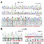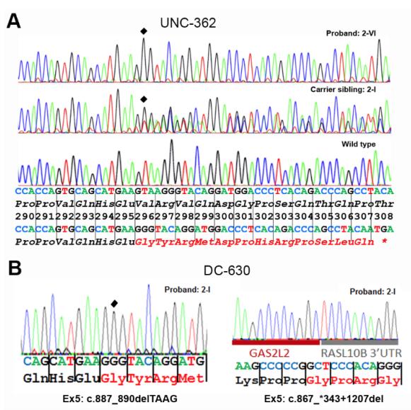 Figure S1: Sanger sequencing of pathogenic genetic variants discovered in GAS2L2. (A) Sequencing of pathogenic variant [c.887_890delTAAG (p.Val296Glyfs*13)] in exon 5 of GAS2L2 (NM_139285.3, Chr.17q12) in affected subject PCD-1367 (2-IV) of family UNC-362, (top), heterozygous (middle) and wild type (bottom). The variant (filled diamond) induces a frameshift in the gene sequence leading to a stop codon in amino acid 308 during translation. (B) Sequencing of compound heterozygous variants [c.[887_890del];[867_*343+1207del], p.[(Val296Glyfs*13)] ;(0?)] in exon 5 of GAS2L2 in affected subject DCP-1040 of family DC-630, proband 2-1. As both deletions overlap, c.887_890del was seen as hemizygote; allele in trans of 867_*343+1207del was not co-amplified because of higher amplicon size (3,931 bp compared to 267 bp for the 867_*343+1207del allele PCR product). Base sequences, amino acid sequences, and codon numbers are shown. Mutated amino acids are represented by red fonts. |