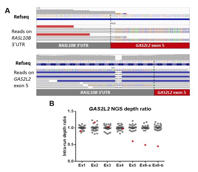 Figure S2: Proband DCP-1040 is an obligatory compound heterozygous. (A) Breakpoints of the c.867_*343+1207del large deletion (3,931 nucleotides) in GAS2L2. Panels show overlapping read sequences aligned on RASL10B (upper) or GAS2L2 (lower). The 5’-breakpoint localizes within GAS2L2 exon 5 and 3’-end is within the 3’UTR of RASL10B. The lower panel also shows 7 reads encompassing the 4-nucleotide c.887_890del GAS2L2 deletion, which demonstrates the compound heterozygous genotype. Parallel sequencing data are shown as not reverse-complemented in the IGV viewer. (B) GAS2L2 copy-number variation analysis in subject DCP-1040 by parallel sequencing depth ratio analysis. Plot shows normalized depth ratio for 24 subjects analyzed within the same run. Mean depth for each capture probe was first normalized for each subject against the contribution of each subject to the run global depth. For each probe, the mean of the normalized depth ratio was calculated and adjusted to 1. Each point corresponds to the depth ratio of each controls (n= 23 grey symbols) or subject DCP1040 (red symbols). Error bars show the standard error of the mean. Exon 6, which is a large exon, was captured by two probes (Ex6-a and Ex6-b). Data highlight a heterozygous loss of most of exon 5 and entire exon 6. |