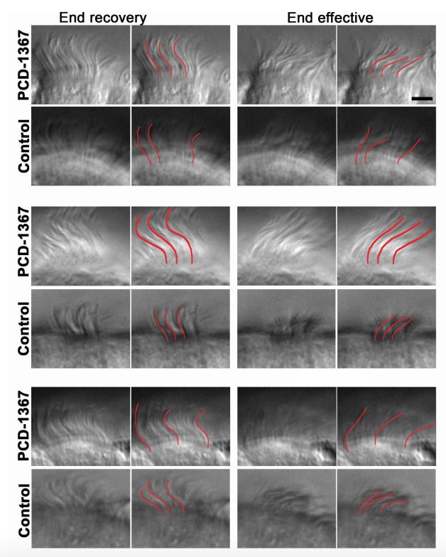 Figure S5: Normal waveform of ciliary beat in GAS2L2 deficient cells. High-resolution videos of control and PCD ciliated cells were observed and the waveform was traced manually. The images represent a time point of the cilia seen in profile during the end recovery (left panels) and end effective positions (right panels). For each stroke position, a panel highlighting the cilia in red is shown. Scale bar, 4 µm |
