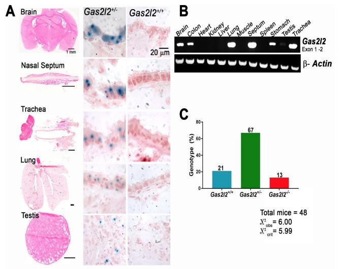 Figure S6: Expression of Gas2l2 in mouse tissue and the effects of lack of Gas2l2 on Mendelian distribution. (A) β-galactosidase staining of different mouse tissue. The whole tissue section is shown in the left panel. Positive β-galactosidase staining was observed in tissues from Gas2l2+/- mice carrying the LacZ reporter (middle panel). No staining was observed in Gas2l2+/+ mice (negative control, right panel). (B) Total RNA from different mouse tissues was extracted and the expression of Gas2l2 was evaluated by RT-PCR. Reference, β-Actin. (C) Inheritance ratio in Gas2l2+/- cross follows Mendelian distribution. |