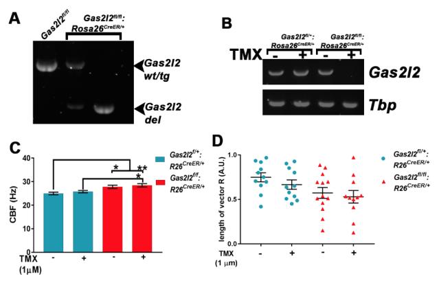 Figure S8: mTEC cultures from Gas2l2-/- :R26CreER/+ mice had affected ciliary beat and orientation. (A) RT-PCR confirmed the spontaneous deletion of Gas2l2 in Gas2l2-/- :R26CreER/+ mice. Mice with 100% deletion did not survive. (B) The deletion of Gas2l2 in mTEC cultures treated with tamoxifen (TMX) was corroborated by RT-PCR. (C) The CBF in Gas2l2-/- :R26CreER/+ mTEC cultures treated with TMX was hyperkinetic compared to control (n = 3 biological replicates, 3 technical replicates each. ** p = 0.0019, * p < 0.05). (D) The orientation of basal body-basal foot was scored in EM images. The length of the vector (0< R <1) for each cells is represented in the graph. The average length of the vector was shorter in Gas2l2-/- :R26CreER/+ ciliated cells treated with TMX compared to control cells. |