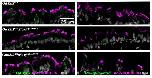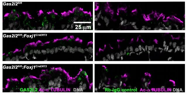 Figure S9: Confirmation of partial deletion of Gas2l2. Trachea sections of control and Gas2l2 conditional-KO mice treated with TMX were stained for GAS2L2 (green), Acetylated- α TUBULIN (magenta), and DNA (gray) (left panels). In the Gas2l2 conditional-KO two patterns of staining were observed: mice with reduced positive staining for GAS2L2 (middle panel) and mice with close to normal positive staining (bottom panel). The corresponding negative control using anti-rabbit-IgG is shown (right panels). |
