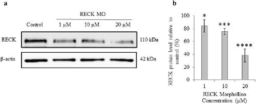 Fig. 1. Treatment of A6 cells with RECK MO resulted in decreased RECK protein levels. Immunoblot analysis was used to confirm reduction of RECK protein following treatment of A6 cells with RECK MO using Endo-porter delivery reagent. Protein was extracted from cells 48 h following treatment with increasing concentrations of RECK MO. a Knockdown of RECK protein occurred in a dose-dependent manner. β-actin is used as a loading control. b Quantification of protein levels in a were graphed and data is based on 3 biological replicates (meanâ±âSD) and normalized to control (set to 100%). Data is analyzed via t test; *, pââ¤â0.05; ***, pââ¤â0.001; ****, pââ¤â0.0001