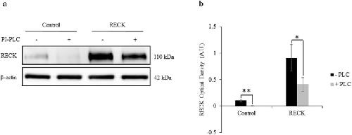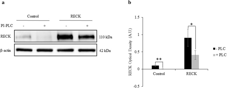Fig. 5. Solubilization of RECK proteins following PI-PLC treatment. a Twenty-four hours following transfection of RECK constructs, control and transfected A6 cells were treated with PI-PLC for 24 h and cell lysate collected and analyzed by Western blot. b Densitometry quantification demonstrates that the level of RECK proteins bound to the cell is significantly reduced following PI-PLC treatment in both mock-transfected and RECK-transfected cells. β-actin is used as a loading control. Graphed data is based on 3 biological replicates (meanâ±âSD). Data is analyzed via t-test; *, pââ¤â0.05; **, pââ¤â0.01