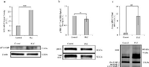 Fig. 6. PI-PLC treatment caused an increase in MT1-MMP protein and MMP-2 activity levels. a Densitometry quantification of MT1-MMP protein level normalized to β-actin in control A6 cells treated with PI-PLC. MT1-MMP protein levels significantly increased in PI-PLC-treated cells compared to untreated cells (set to 1). b Densitometry quantification of pERK normalized to total ERK levels. pERK protein levels did not significantly change following PI-PLC treatment. c Gelatin zymography was used to measure protein levels of secreted pro-, intermediate, and active MMP-2 following PI-PLC treatment in A6 cells. Data is presented as the ratio between active and total (pro-, intermediate, and active) MMP-2 levels between untreated cells and PI-PLC treated cells. Active/total MMP-2 levels significantly increased in the media of PI-PLC-treated cells compared to untreated cells (set to 1). Secreted MMP-9 protein could not be detected at the expected size of 92 kDa (shown by the arrow). Graphed data is based on 3 biological replicates (meanâ±âSD). Data is analyzed via t-test; ns, pâ>â0.05; *, pââ¤â0.05; **, pââ¤â0.01