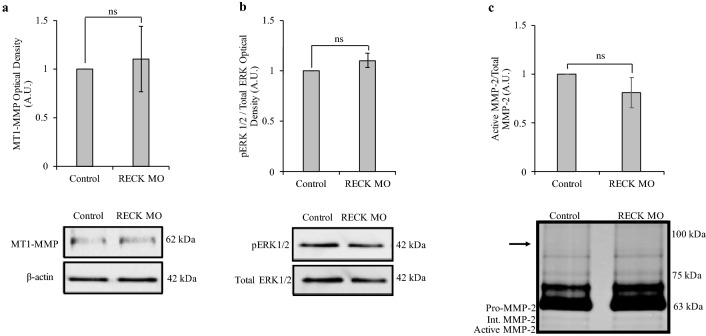 Fig. 2. RECK reduction did not alter MT1-MMP or pERK protein levels nor MMP-2 activity levels. a Densitometry quantification of MT1-MMP immunoblotted protein normalized to β-actin. MT1-MMP protein levels did not significantly change in RECK knockdown cells compared to control (set to 1). β-actin is used as a loading control. b Densitometry quantification of pERK normalized to total ERK levels. pERK protein levels did not significantly change in RECK reduced cells compared to control (set to 1). c Gelatin zymography was used to measure protein activity of secreted pro-, intermediate, and active MMP-2 following RECK knockdown in A6 cells. Data is presented as the ratio between active and total (pro-, intermediate, and active) MMP-2 levels between control and RECK reduced cells. Active/total MMP-2 levels did not significantly change in the media of RECK reduced cells compared to control (set to 1). Secreted MMP-9 protein could not be detected at the expected size of 92 kDa (shown by the arrow). Graphed data is based on 3 biological replicates (meanâ±âSD). Data is analyzed via t-test; ns, pâ>â0.05