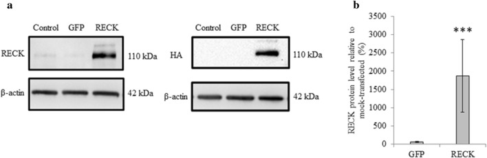 Fig. 3. Transfection of full-length HA-tagged RECK constructs in A6 cells resulted in increased RECK levels. a Immunoblot analysis was used to confirm overexpression of RECK protein following transfection of RECK cDNA constructs. Mock-transfected and GFP-transfected A6 cells were used as controls. Protein was extracted from cells 24 h following transfection. β-actin is used as a loading control. Left panel demonstrates increased levels of RECK protein compared to control using a RECK antibody, while right panel confirms the presence of HA-tagged proteins only in RECK-transfected A6 cells using an HA antibody. b Graphed data is based on 3 biological replicates (meanâ±âSD) and normalized to control (set to 100%). Data is analyzed via t-test; ***, pââ¤â0.001