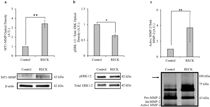 Fig. 4. RECK overexpression increased MT1-MMP protein and MMP-2 activity levels and decreased pERK protein levels. a Densitometry quantification of immunoblots of MT1-MMP protein normalized to β-actin. MT1-MMP protein levels significantly increased in RECK-overexpressing cells compared to control (set to 1). b Densitometry quantification of pERK normalized to total ERK levels. pERK protein levels significantly decreased in RECK-overexpressing cells compared to control (set to 1). c Gelatin zymography was used to measure protein levels of secreted pro-, intermediate, and active MMP-2 following RECK overexpression in A6 cells. Data is presented as the ratio between active and total (pro-, intermediate, and active) MMP-2 levels between control and RECK-overexpressing cells. Active/total MMP-2 levels significantly increased in the media of RECK-overexpressing cells compared to control (set to 1). Secreted MMP-9 protein could not be detected at the expected size of 92 kDa (shown by the arrow). Graphed data is based on 3 biological replicates (meanâ±âSD). Data is analyzed via t-test; *, pââ¤â0.05; **, pââ¤â0.01