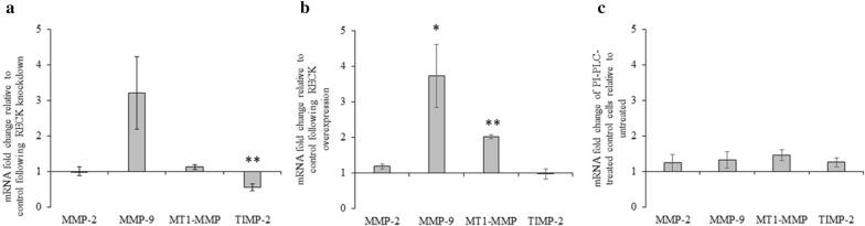 Fig. 7. Effect of RECK knockdown, RECK overexpression, and PI-PLC treatment on mRNA levels. The levels of MMP-2, MMP-9, MT1-MMP, and TIMP-2 mRNA were measured following RECK knockdown, overexpression, and PI-PLC treatment in A6 cells using real-time qPCR. a Following RECK reduction in cells, MMP-2, -9, and MT1-MMP levels did not change significantly compared to control; however, TIMP-2 levels decreased significantly. b Following RECK overexpression, MMP-2 and TIMP-2 mRNA levels did not change significantly, however, MMP-9 and MT1-MMP mRNA levels increased significantly compared to control. c Treatment of cells with PI-PLC did not change MMP-2, -9, MT1-MMP, or TIMP-2 mRNA levels. Changes in gene expression were measured relative to EF1α and normalized to control cells (set to 1). Results are based on 3 biological replicates (meanâ±âSEM; technical replicates, Nâ=â9). Data is analyzed via t-test; *, pââ¤â0.05; **, pââ¤â0.01