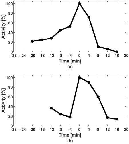 Figure 2. Differences in dynamics of CDK1/CYCBA activation curves in control extracts containing physiological amounts of CDC6. Two extreme examples are shown: Rapid activation taking 16 min (a) and slow activation taking 28 min (b). Note that the inflection points of the curves appear at different moments in relation to the maximum activity.