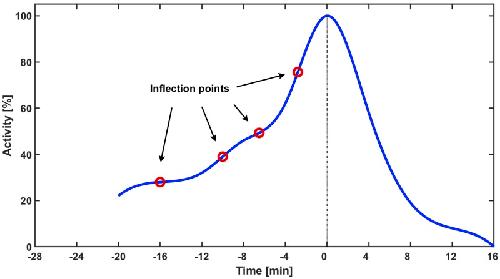 Figure 3. The smoothed curve obtained on the basis of experimental data presented in Figure 1a. Red circles indicate approximate location of inflection points for the setting with CDC6 upon M-phase entry.