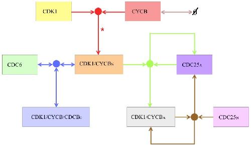 Figure 4. The schematic diagram of the considered system. Colours of arrows and dots correspond to colours of Equations (1)â(5). For simplicity we do not consider the potential marginal separation of the complex CDK1/CYCBN into CDK1 and CYCB. On the diagram we indicate this by â*â.