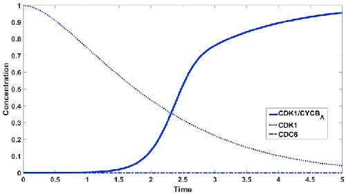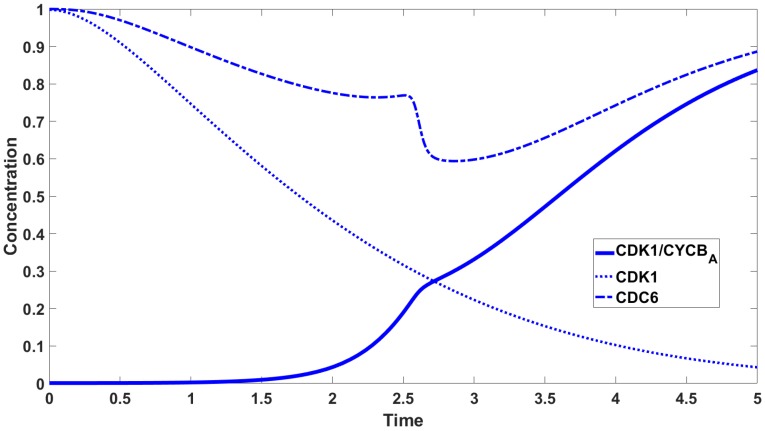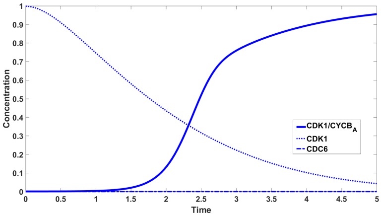 Figure 6. Concentration of CDK1, CDK1/CYCBA, CDC6 in the absence of CDC6.