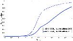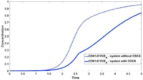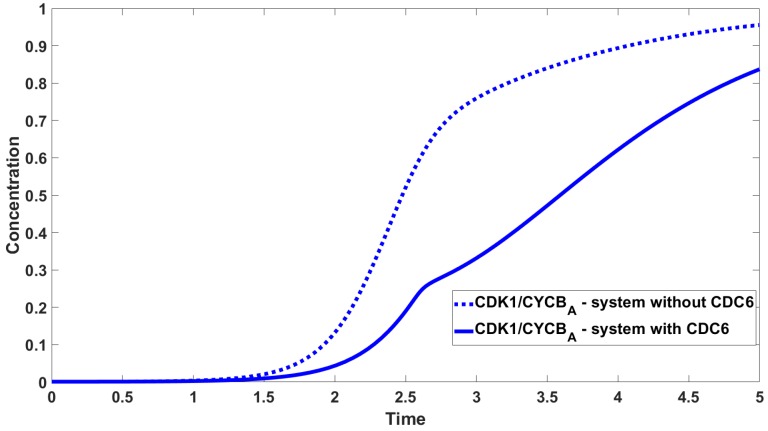 Figure 7. Comparison between concentration of CDK1/CYCBA in the absence and presence of CDC6. Solid lineâsystem with CDC6; dotted lineâsystem without CDC6.