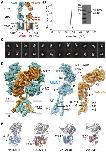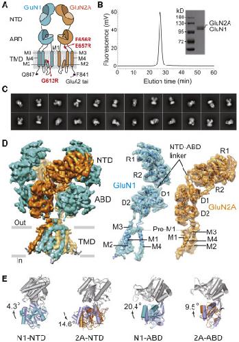(D) Three-dimensional (3D) reconstructed density map of the human GluN1-GluN2A receptor. GluN1 and GluN2A are shown in cyan and orange, respectively, viewed perpendicularly from the overall two-fold y axis of symmetry. Right panels show corresponding coordinate fitting into the density map of the individual GluN1 or GluN2A subunit.