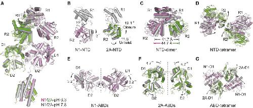 (D) Top-down view shows the conformational change of the NTD tetramer by aligning the full-length receptor.