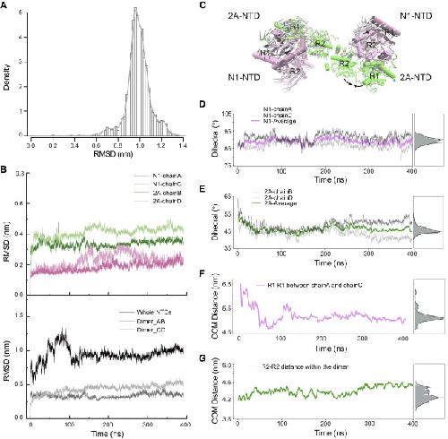 (F and G) Center-of-mass distance changes between the two GluN1-R1 lobes (F) and R2-R2 lobes averaged from the AB and CD heterodimer of GluN1-GluN2A (G) along the whole simulation time.