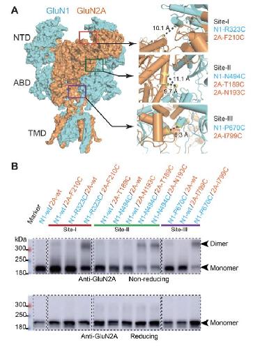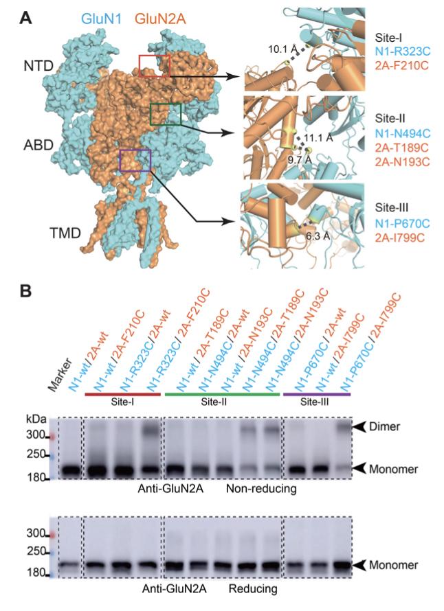 Figure S2. Validation of the inter-subunit interfaces by western blot analysis. Related to Figure 1. (A) Surface representation of the human GluN1/GluN2A receptor, with GluN1 in cyan and GluN2A in orange. Right panel: zoom-in views of the cysteine substitutions at the interfaces between GluN1-NTD-R1 and GluN2A-NTD-R2 lobes (Site-I), GluN2A-NTD-R2 and GluN1-ABD-D1 lobes (Site-II), GluN1-ABD-D2 and GluN2A-ABD-D2 lobes (Site-III). The distances between the Cα of putative crosslinking residues are indicated with dash lines.
