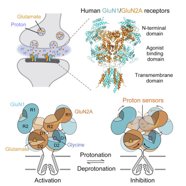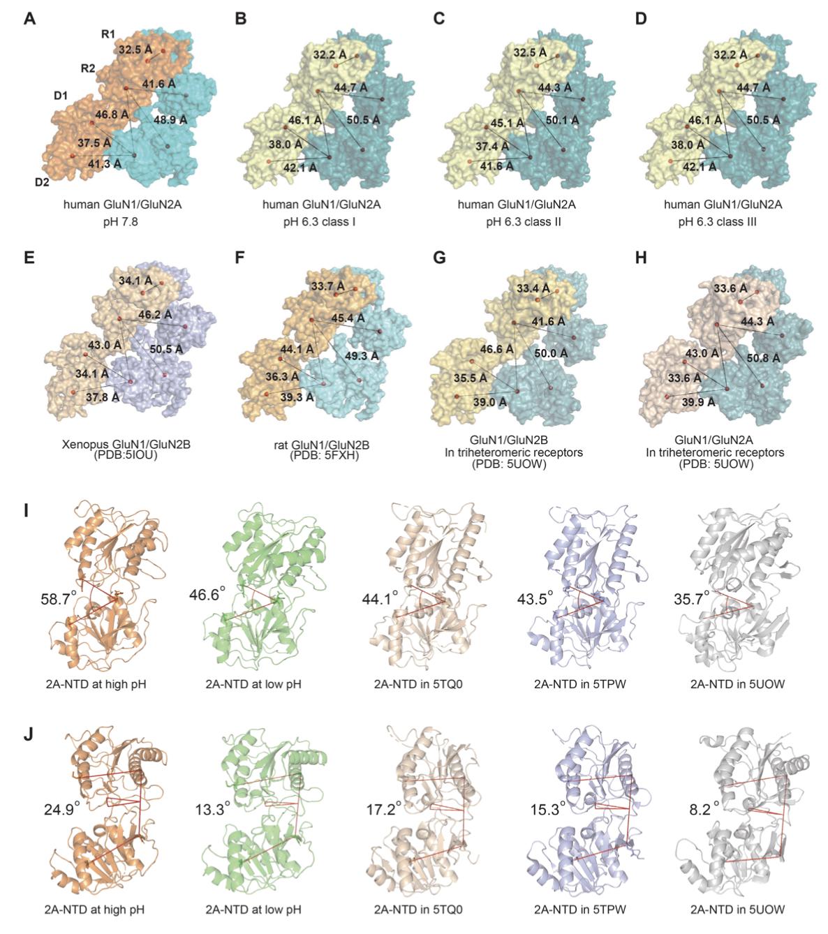 (I-J) Cartoon representation of different states of GluN2A-NTDs in the cryo-EM structures of human GluN1/GluN2A receptors at the high pH or at the low pH of conformation I, in the crystal structure of di-heteromeric rat GluN1/GluN2A NTDs with the presence of zinc chelator EDTA (PDB:5TQ0) or complexed with the presence of zinc (PDB:5TPW), and in the cryo-EM structure of tri-heteromeric GluN1/GluN2A/GluN2B receptor in agonist-bound state at pH 6.5 (PDB:5UOW). (I) represent the dihedral angles of opening and closure, (J) for the dihedral angels of twisting and untwisting. |