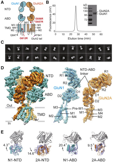 (A) Schematic representation of human GluN1EM (cyan) and GluN2AEM (orange) CTD-truncated constructs. Locations of the point mutations (GluN1G612R and GluN2AE656R,E657R) are highlighted by red points and the GluA2 tail fused to the C terminus of GluN2A is shown with a purple line.