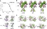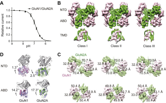 (B) Segmented density map representations of three conformations of GluN1-GluN2A receptors at pH 6.3. GluN1 and GluN2A subunits are shown in pink and green, respectively.