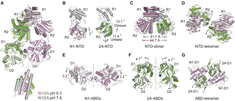 (A) Overall conformational changes of the GluN1-GluN2A heterodimer between the pH 6.3 state (with GluN1 in pink and GluN2A in green) and the pH 7.8 state (gray).