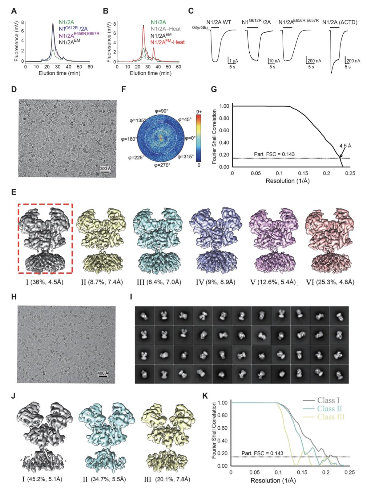 (B) Thermostability test of GluN1WT/GluN2AWT and GluN1G612R/GluN2AE656R,E657R receptors via FSEC experiment. The fluorescence level of GluN1WT/GluN2AWT receptors decreased significantly after heating, while the GluN1G612R/GluN2AE656R,E657R receptors displayed thermostable profiles.