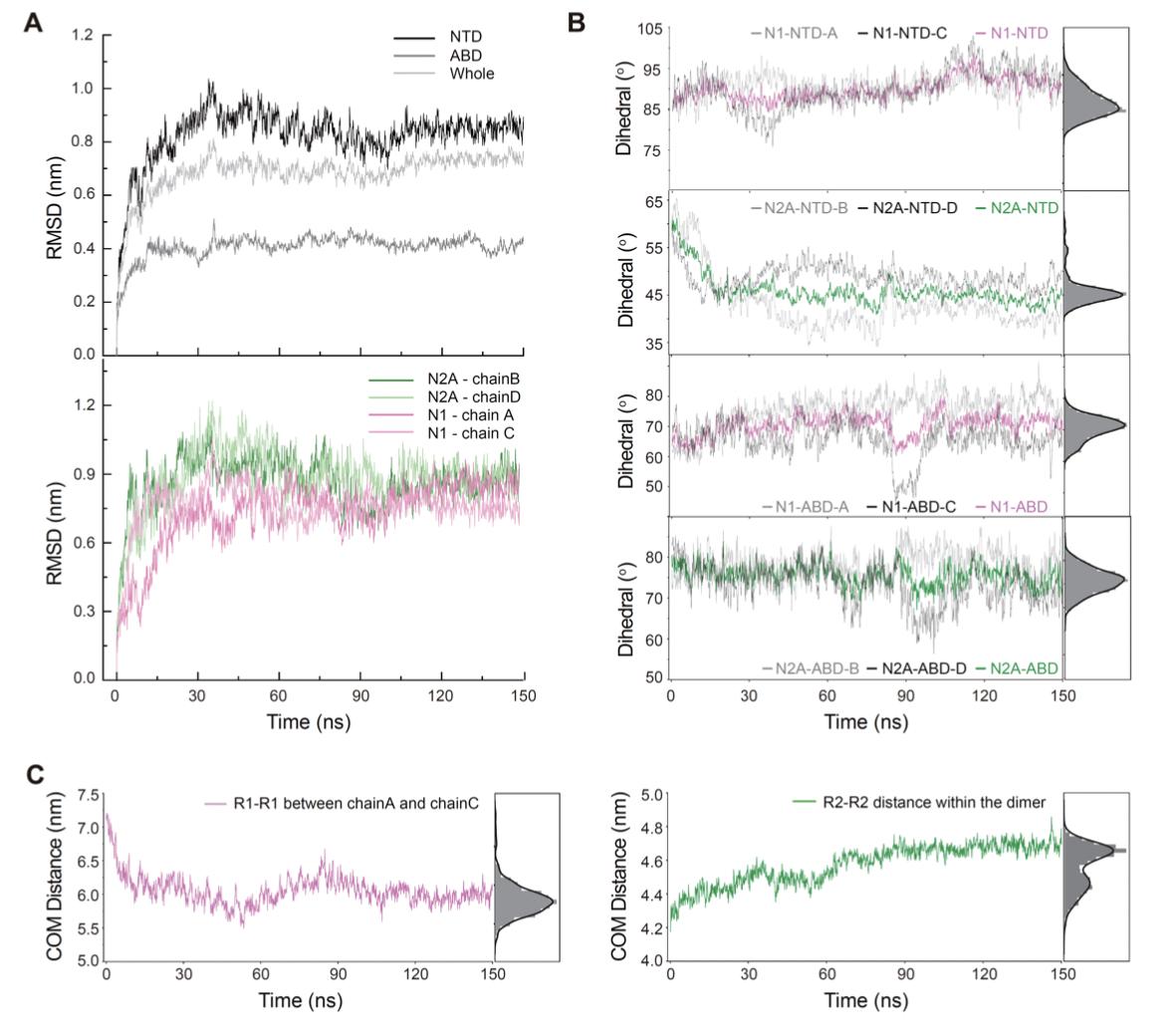 (C) The distance change of center-of-masses between the two GluN1-R1 lobes (left panel) and R2-R2 lobes averaged from the two heterodimers of GluN1/GluN2A (right panel) along the whole simulation time. |
