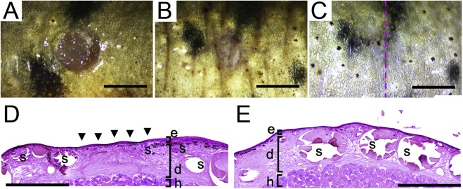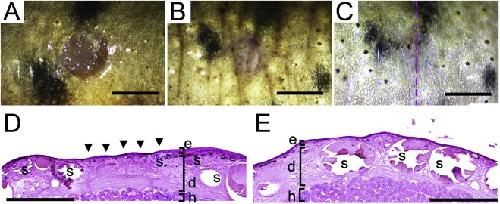 D and E show cross-sections. The dashed line in C indicates a plane of the section in D. Secretion glands were well developed in the intact skin (E). In the central area of regenerating skin (indicated by arrowheads in D), the secretion glands were small and undeveloped at 4 weeks after wounding. e, epidermis; d, dermis; h, hypodermal tissues; s, secretion glands.