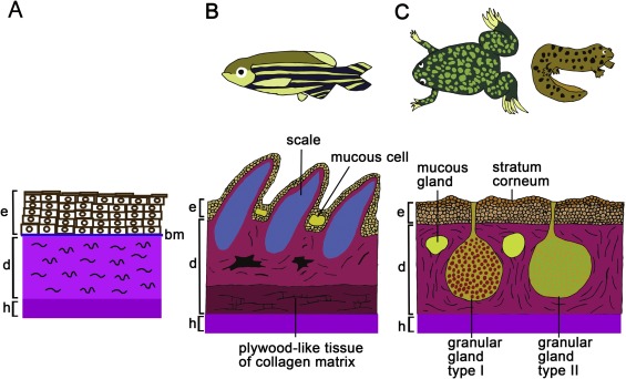 C. In amphibians, the skin has a single keratinized layer (stratum corneum) along the surface of the epidermis. Mucous glands and granular glands are located in the dermis. e, epidermis; d, dermis; h, hypodermal tissues; bm, basement membrane. Panels B and C are modifications of Figs. 7 and 8 in Schempp et al. [17].
